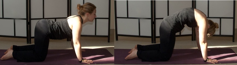 2) Cat / Cow. From all four, inhale to arch the spine and look up and exhale round the spine, stretching out the upper back. Perform this slowly linking the breath and the movement. Repeats 5-10 times.