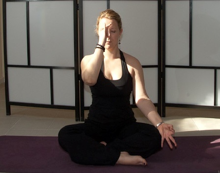 4) Come up to seated for Chandra Bedhana single nostril beathing. Using your right hand, fold in the index finger and middle finger. Place the right thumb onto your right nostril, blocking the flow of air. Inhale through the left nostril, release your thumb and exhale through both nostrils. Repeat 12-16 times.