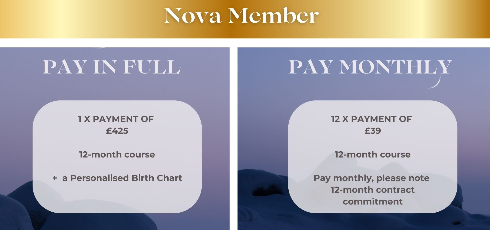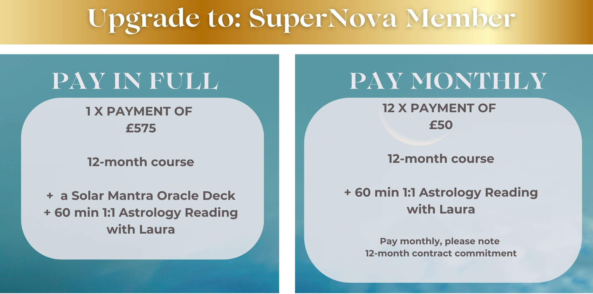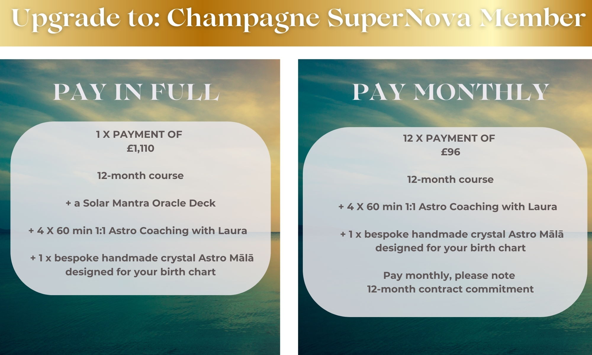Nova provides full access to the core course, while Super Nova offers the added benefit of a one-on-one coaching call to help you apply astrology on a personal level. For those seeking the ultimate transformation, Champagne Super Nova takes it even further, offering quarterly 1:1 sessions for ongoing, tailored support throughout the year. It’s perfectly fine to start with Nova, but if you’re ready to indulge in a more powerful experience, why not treat yourself to Super Nova or Champagne Super Nova and take your growth to new heights?